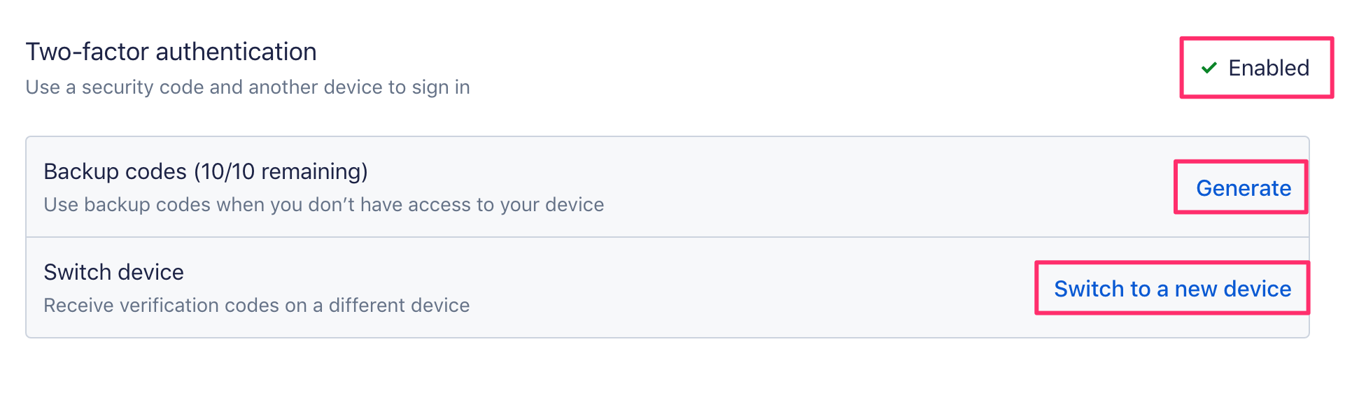 On the Settings tab, you can also enable or manage two-factor authentication or 2FA. 2FA is an extra layer of protection for your ActBlue Express account that requires you to provide two independent pieces of verification when logging in. If 2FA is enabled, you can switch your two-factor device or generate backup codes.
