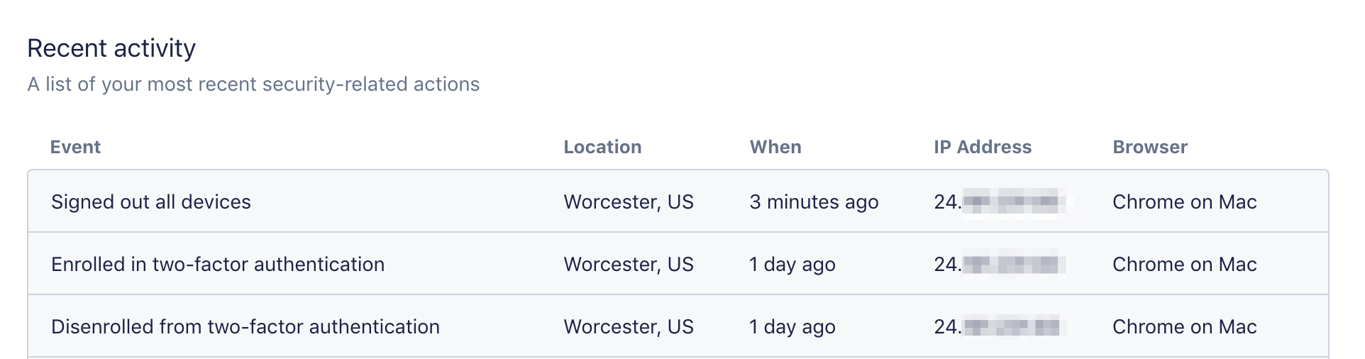 Under the Recent Activity heading, you can view security-related activity on your account, such as password changes or 2FA enrollment: