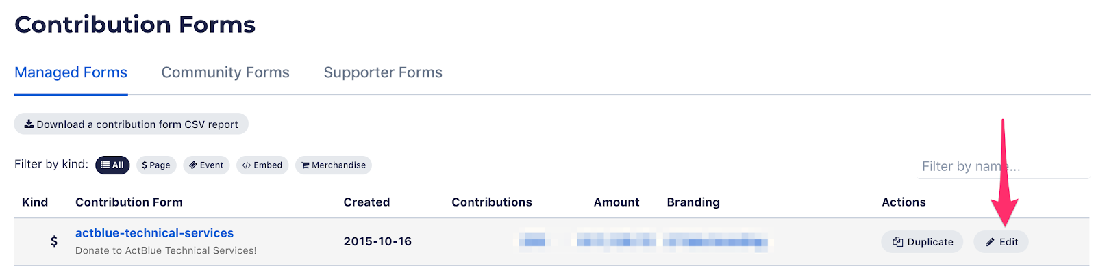 To enable this tool, locate your contribution form via the Contribution Forms tab in your Dashboard toolbar. Then click the “Edit” button next to your form to open the form editor.