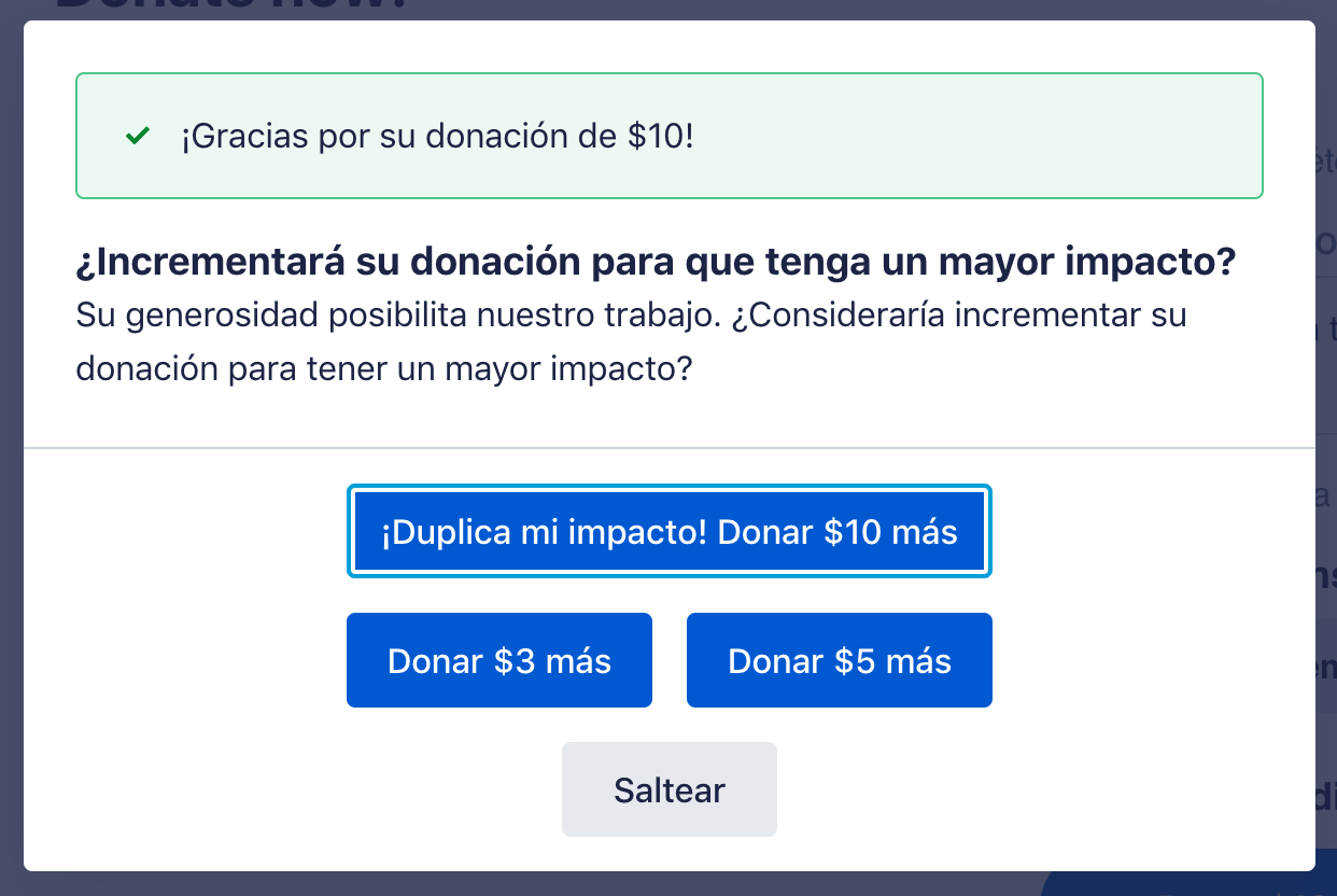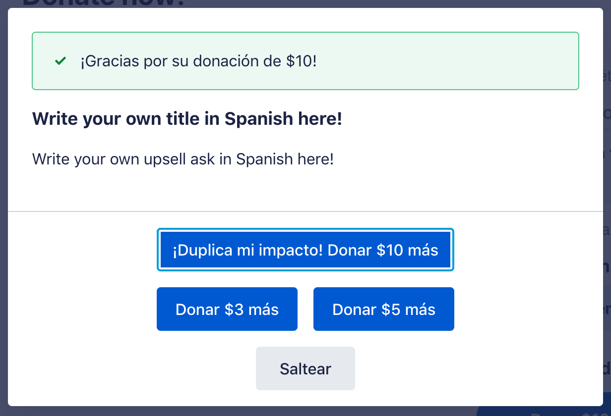 If you choose to translate your form’s standard ActBlue-provided text into Spanish in the “Form customization” tab of your form editor, which we explain how to do here, the default language in the Smart Boost upsell will also be translated into Spanish.