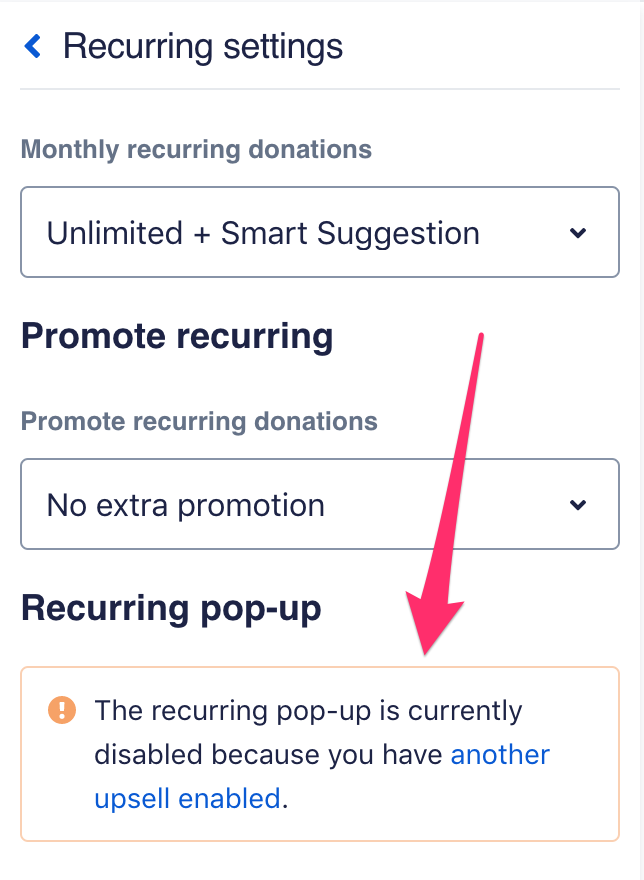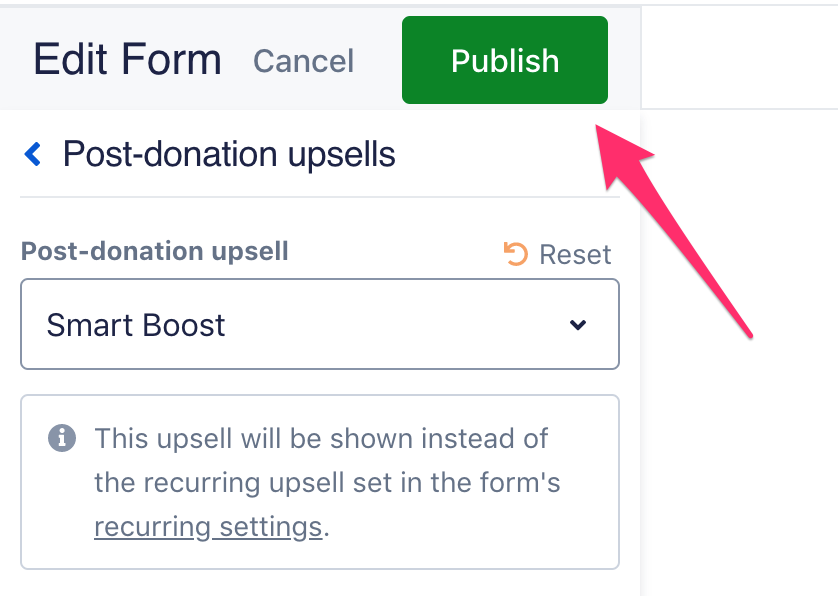 Please note: If you choose to enable the Smart Boost upsell, your donors will not see a recurring upsell after they donate, even if you have the recurring upsell enabled in the “Recurring settings” tab of the form editor. However, a donor can still choose to make their contribution recurring on the form itself! In that case, Smart Boost will not add on to the recurring contribution amount, only the initial contribution. So if they donate a recurring amount of $5, and then choose to increase their donation by $1 in the Smart Boost upsell, their first charge will be for $6. But their future recurrences will be $5! Additionally, Smart Boost will not affect a recurring incentive or recurring pitch that you choose to add to your form.