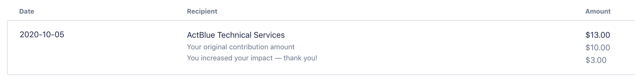 If a donor commits to increasing their contribution on the Smart Boost upsell, they’ll receive a receipt in their email inbox with the details of the contribution. The receipt includes the dollar amounts of their original contribution, the additional contribution that increased their impact, and the total amount they donated to your campaign or organization.