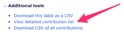 At the bottom of your form's Statistics page, click the 'Additional tools' dropdown to find the list of detailed contributions.