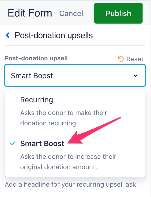 Then, select “Smart Boost” from the “Post-donation upsell” dropdown menu.