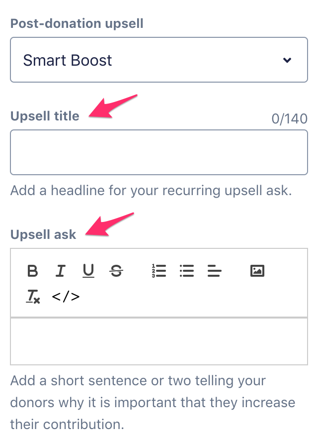 Once you select “Smart Boost” from the dropdown menu in the “Post-donation upsells” tab, you will be able to customize the upsell title and ask. We encourage you to personalize this copy to let donors know why you would like them to increase their impact.