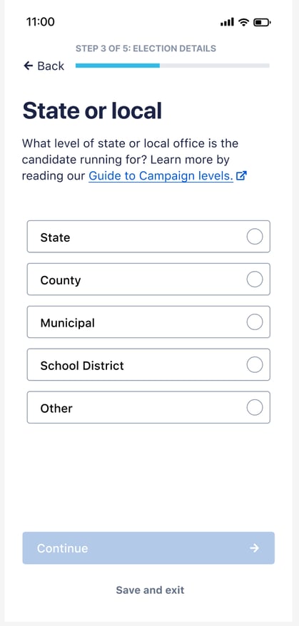You'll have to answer a few questions during the application process. The first is whether your campaign is federal or non-federal (often called ‘state and local’). If you choose state or local, we’ll ask if you’re running for a judicial office. Judicial offices involve individuals who preside over legal matters, interpret laws, and make decisions in the interest of justice.