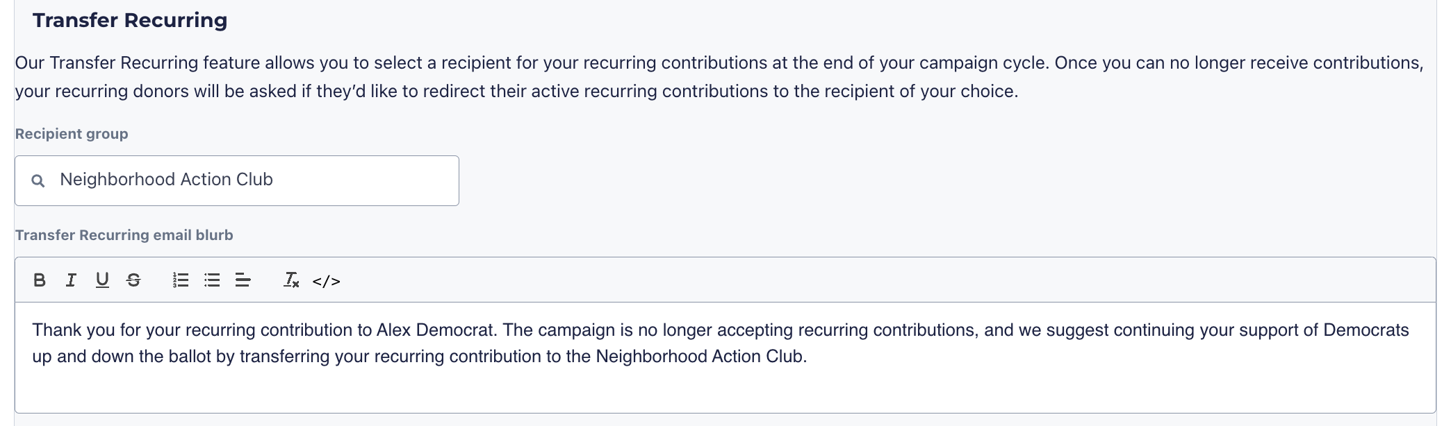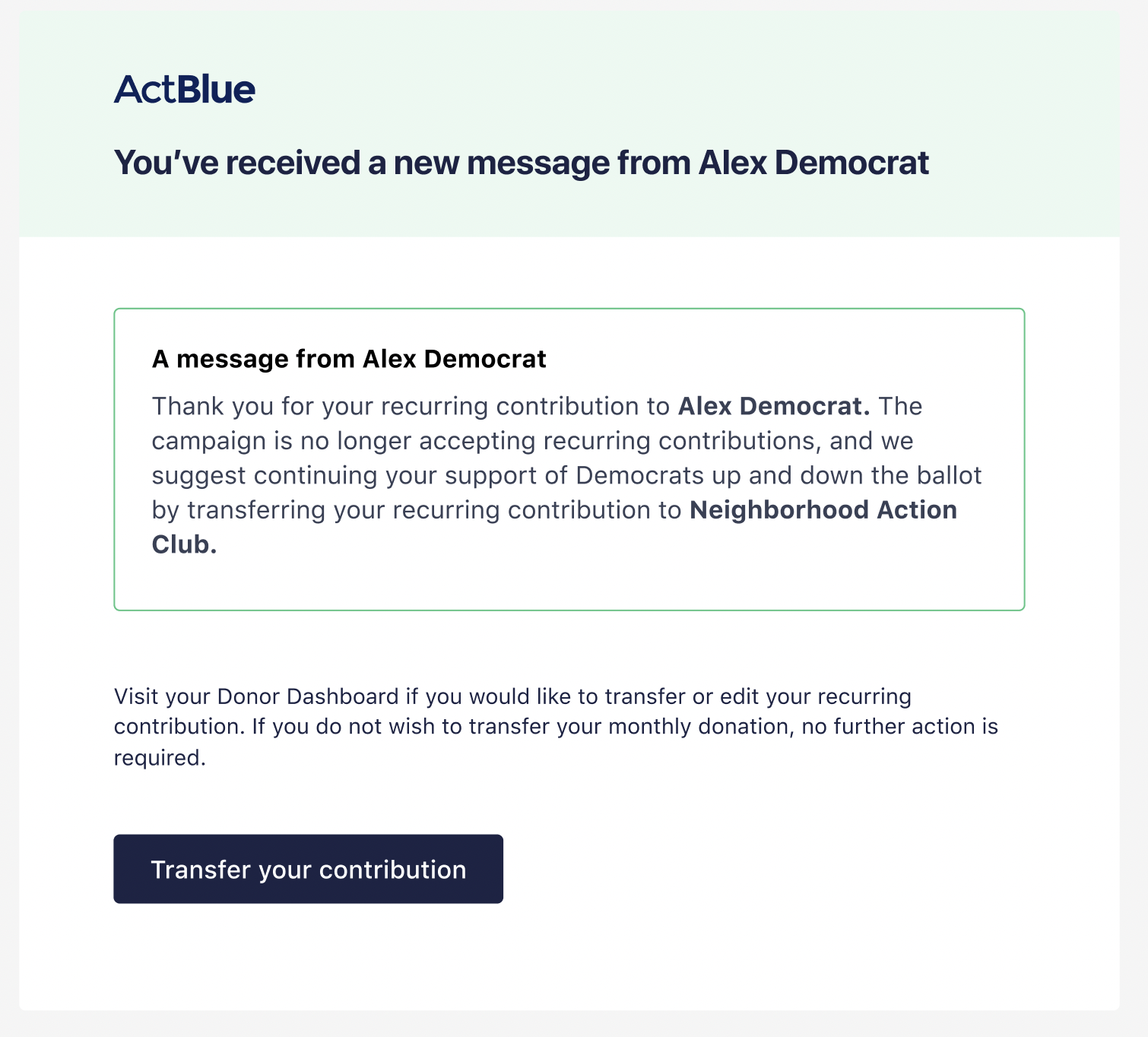 ActBlue's Transfer Recurring feature allows you to select a new recipient for your campaign or organization's recurring contributions.