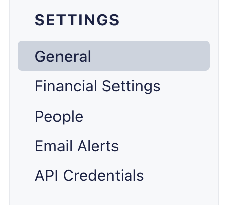 To do this, log onto your ActBlue Dashboard and select General from the Settings menu on the left-hand side of your screen: