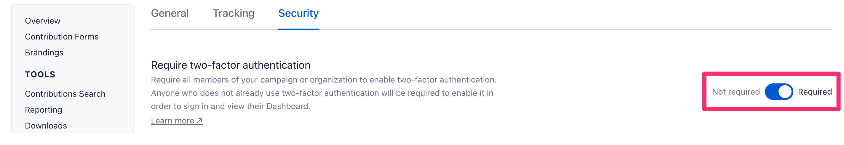 If you're currently an Admin user on your campaign or organization's Dashboard, you can require all users on that Dashboard to set up two-factor authentication (or 2FA) in order to access it.