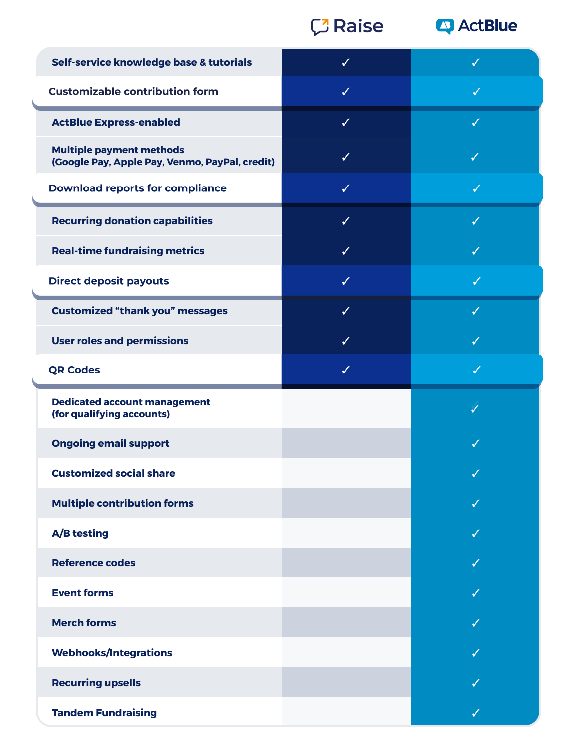 See the chart below for a comparison of ActBlue Classic and Raise by ActBlue to help determine which is right for you.